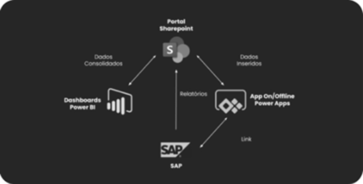 Aplicativo próprio em Power Apps: funcionamento online e offline, garantindo que a operação nunca pare.
